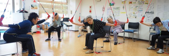全身のさまざまな筋肉を伸縮させることで、筋力の回復、アップを目指します。天井から吊るされた運動専用ロープを使用し、痛みや緊張を伴わず、効果的な柔軟体操が行えます。手足の運動と一緒にお腹の深い部分にある筋肉=インナーマッスルを鍛えることで、上半身の可動域を拡げます。運動ロープが体の動きを助けてくれるので、体を動かしにくい方でも安心、安全に行えます。座ったままでできるプログラムを中心に、豊富なバリエーションで効果的なトレーニングを提供しています。
